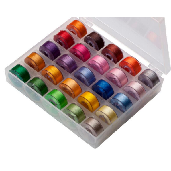 25 pcs. assorted colours, plastic-sided pre-wound bobbins in a plastic box